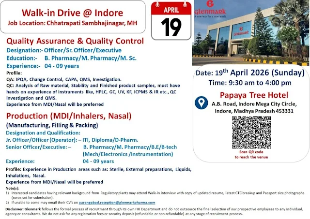 Glenmark Pharmaceuticals Walk-In Recruitment Drive: Glenmark Pharmaceuticals is conducting a walk-in interview drive at Indore for its manufacturing facility at Chhatrapati Sambhajinagar (formerly Aurangabad). This is great opportunity for pharmacy and technical professionals.